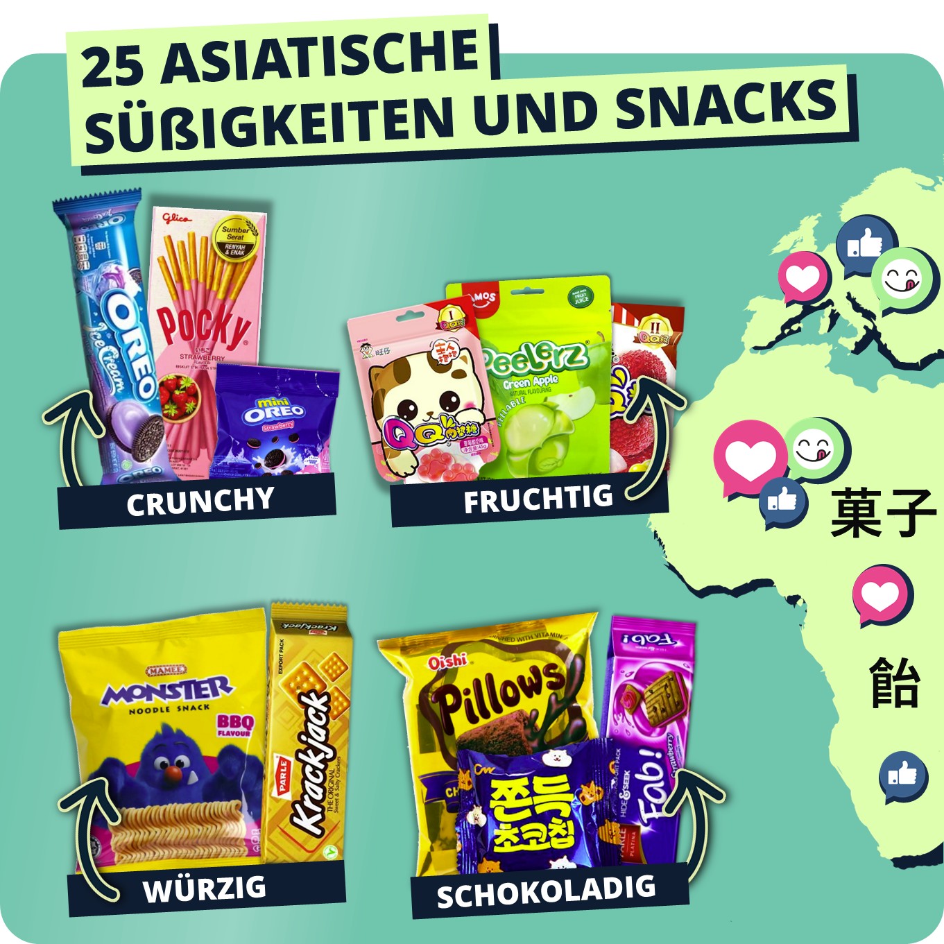 🍬 VIELFALT: Tolle Mischung mit 25 Teilen bestehend aus den angesagtesten Candys aus Japan, Korea und ganz Asien – mit neuen Geschmackserlebnissen, knisternden Explosionen und monströsen Überraschungen.